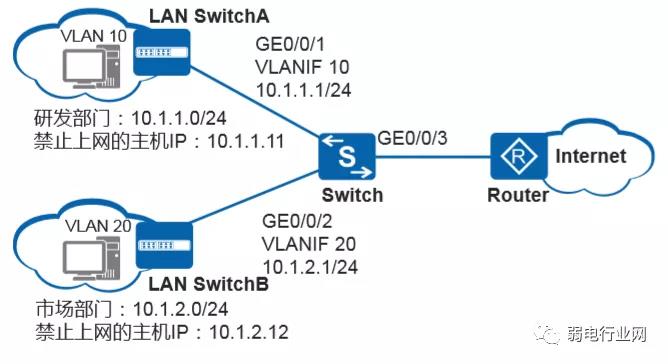 某公司通过交换机实现各部门之间的互连。现要求Switch能够禁止研发部和市场部的部分主机访问外网,防止公司机密泄露。以华为例。
